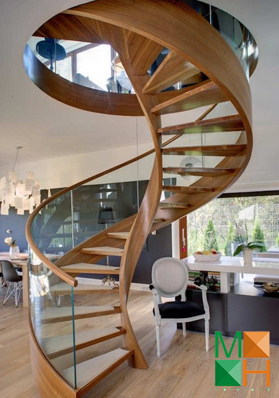 Cầu thang gỗ lan can kính hoàn toàn là sự lựa chọn thông minh và đúng đắn cho gia chủ muốn tạo sự phá cách trong thiết kế nội thất gia đình mình. Hơn nữa, việc sử dụng cầu thang xoắn còn tiết kiệm diện tích cho căn hộ hơn các loại cầu thang khác.