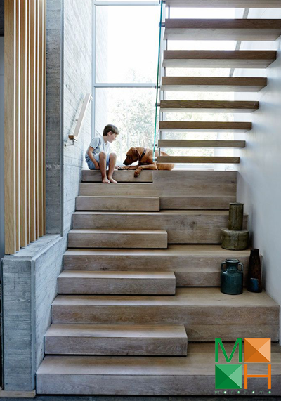 Điểm độc đáo của chiếc cầu thang gỗ này là sự đan xen liên tục giữa một bậc cầu thang ngắn và một bậc cầu thang dài trông rất lạ mắt. Một nửa phía trên của chiếc thang có sự kết hợp của lan can kính tạo độ an toàn. Đồng thời, tận dụng ánh sáng ngoài trời và sự khúc xạ ánh sáng của kính cường lực làm cho không gian nhà bạn tràn ngập màu sắc tự nhiên.